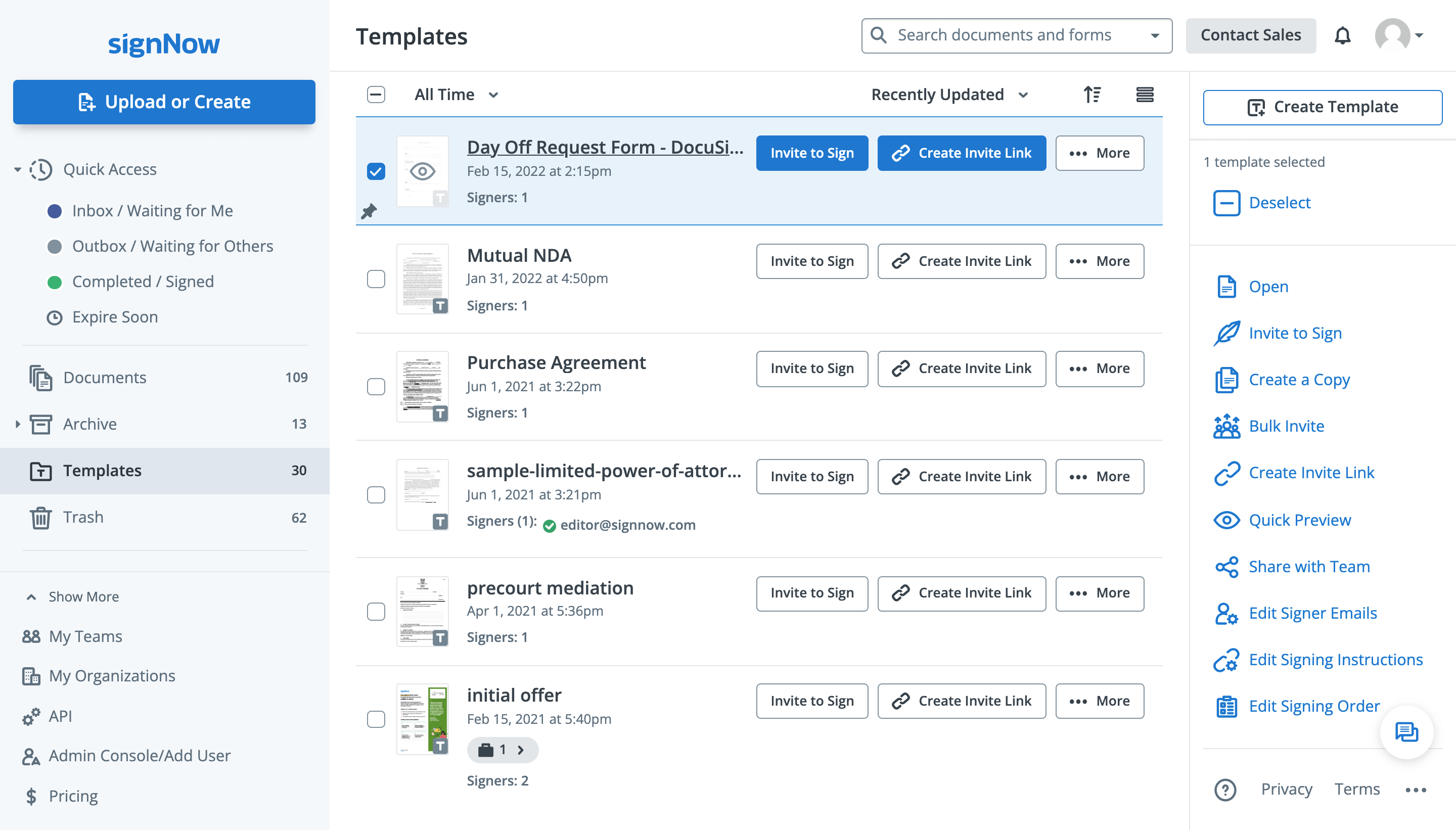 - Uploaded templates are saved to the Templates folder where you can use them to create signature invites or signing links.