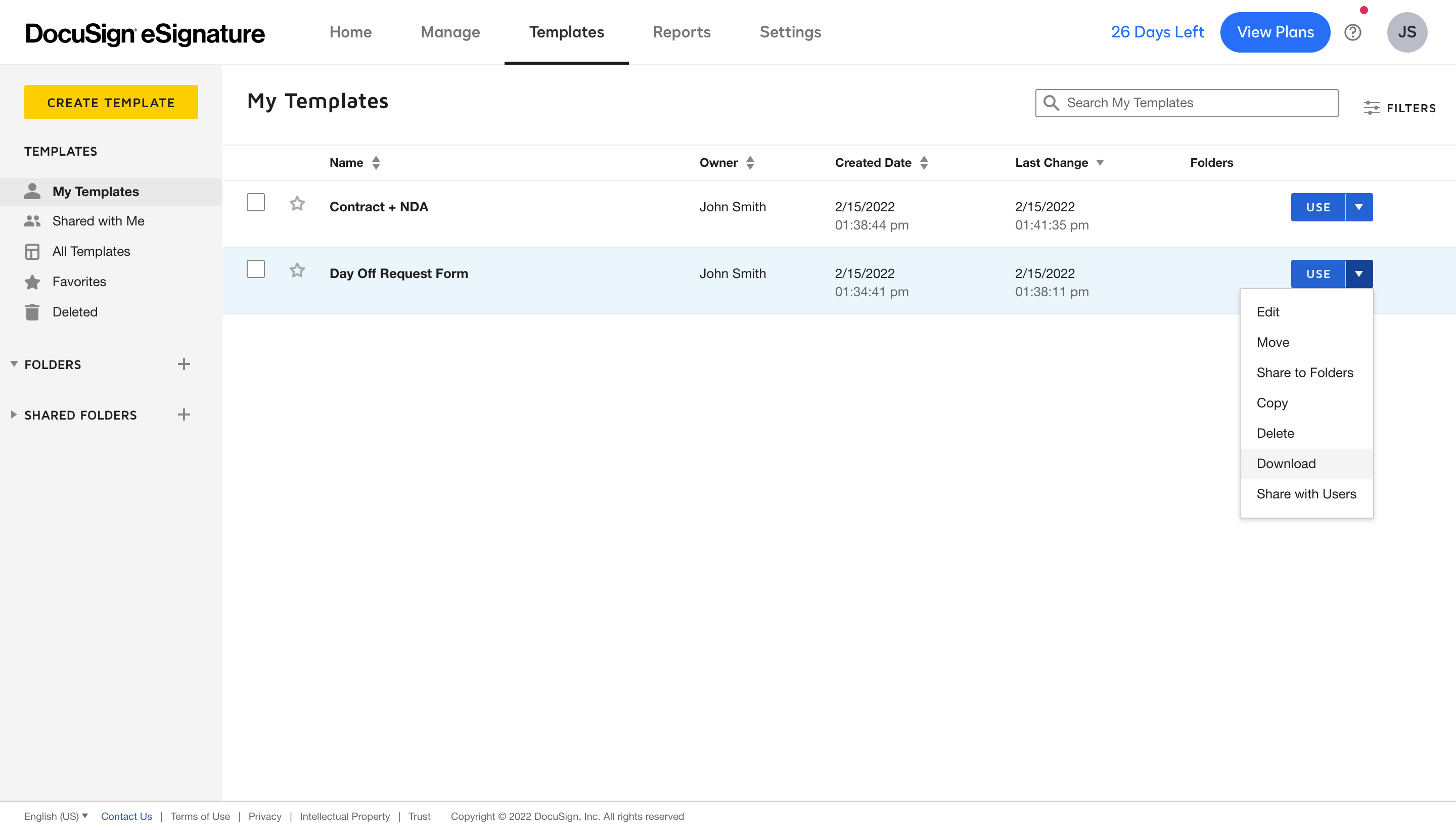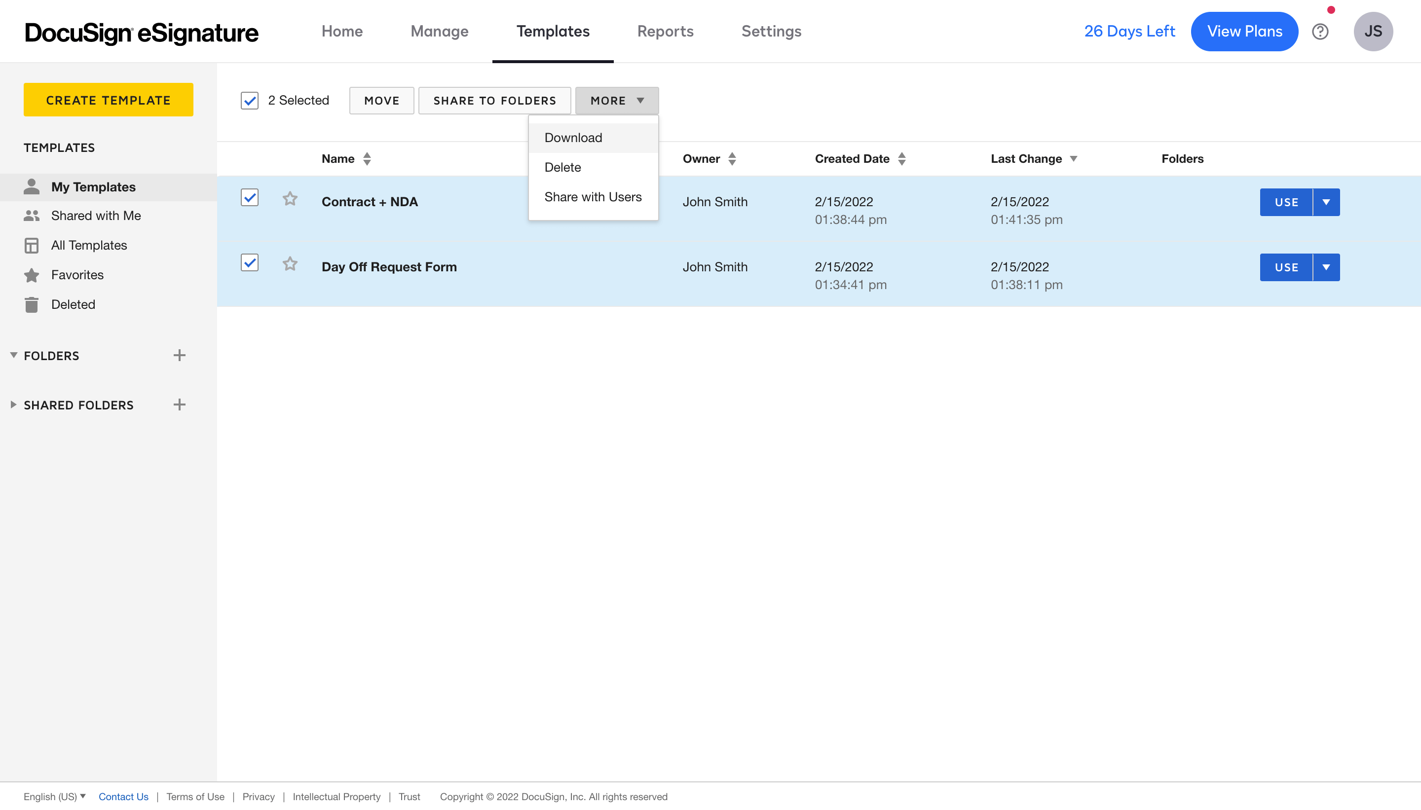 To download multiple DocuSign templates at once, select all the templates you need and click More > Download in the action panel.