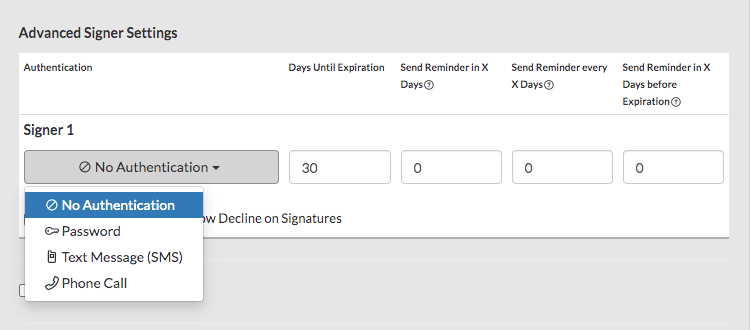 Click Advanced options to set advanced signer settings. Request signer authentication to ensure your document cannot be accessed by anyone other than your intended recipient.