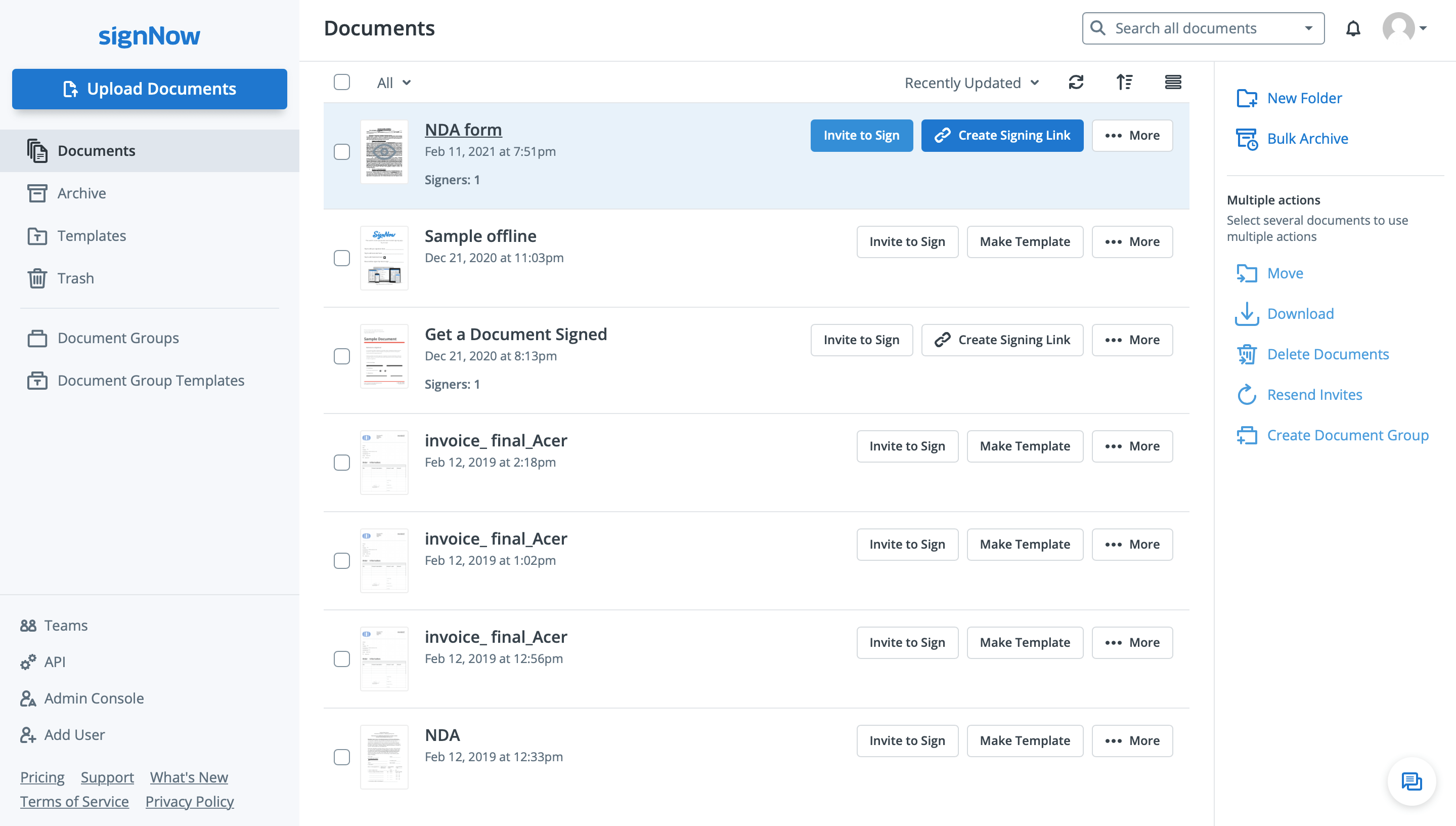 Click the Invite to Sign button next to the name of the document you want to send for signing.