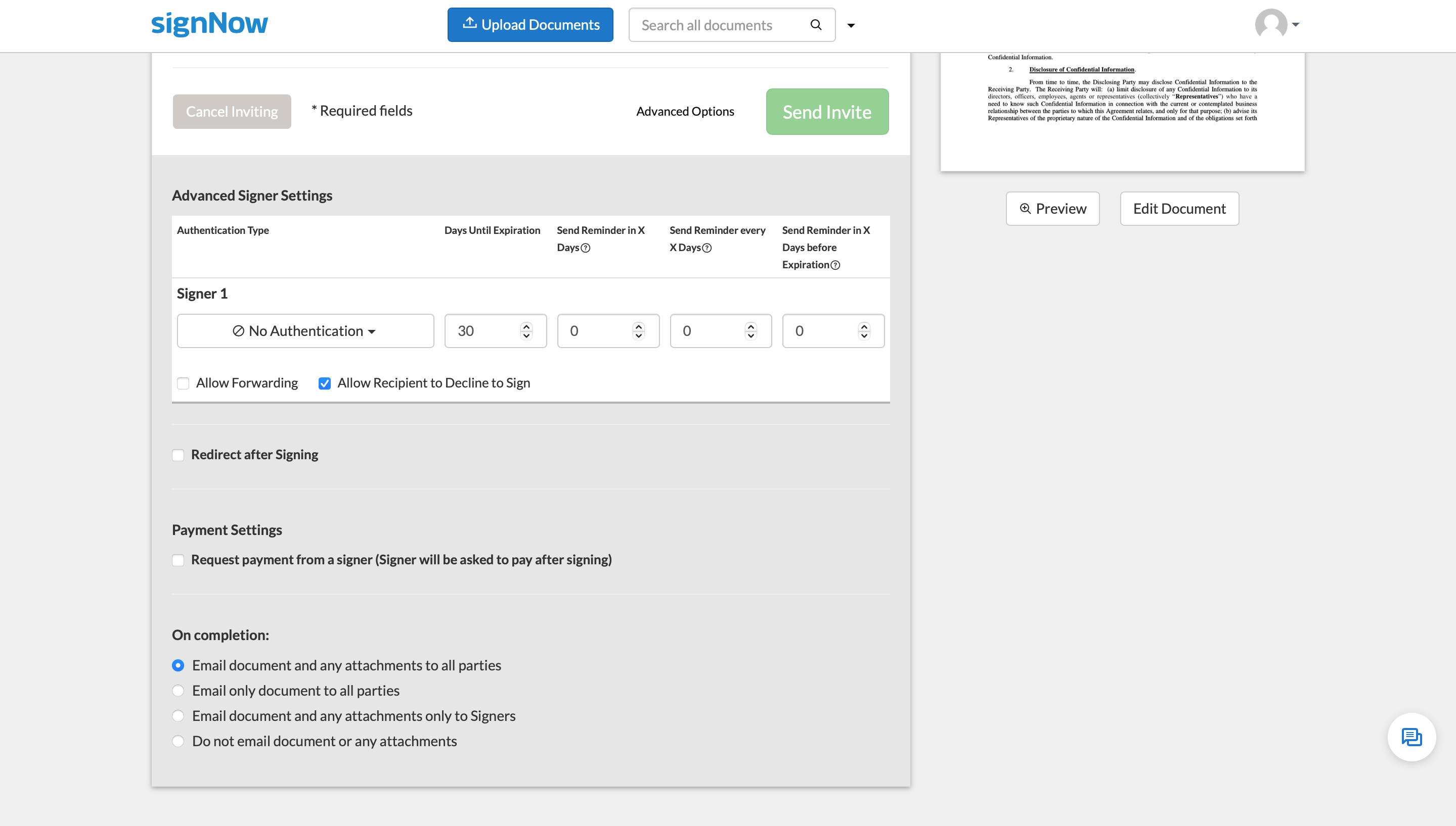 Below the Advanced Signer Settings table, check the Allow Recipient to Decline to Sign box. Then, click Send Invite.