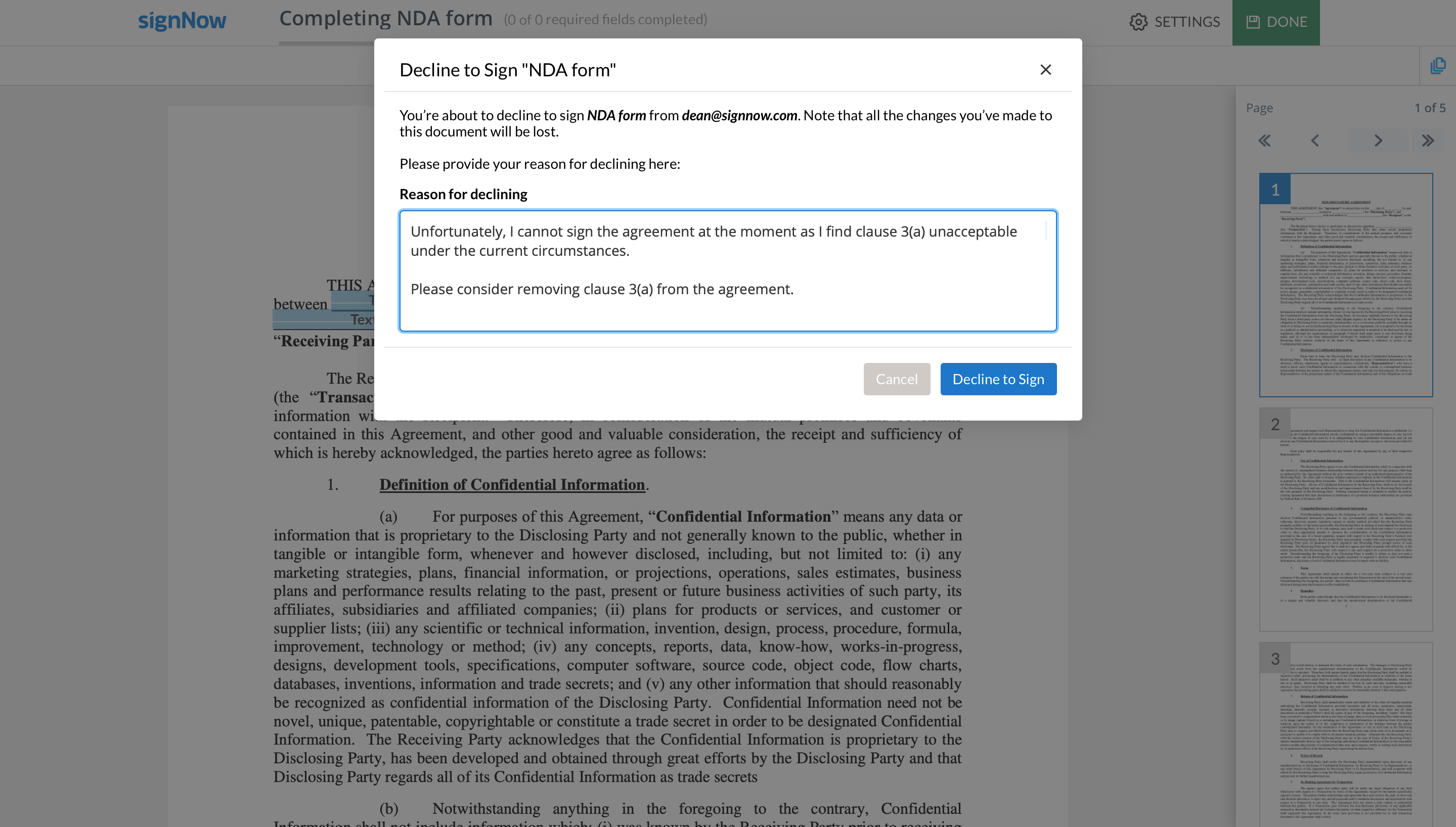 This feature is especially useful during contract negotiations as a recipient can specify reasons for declining and request changes to a document before signing it.
