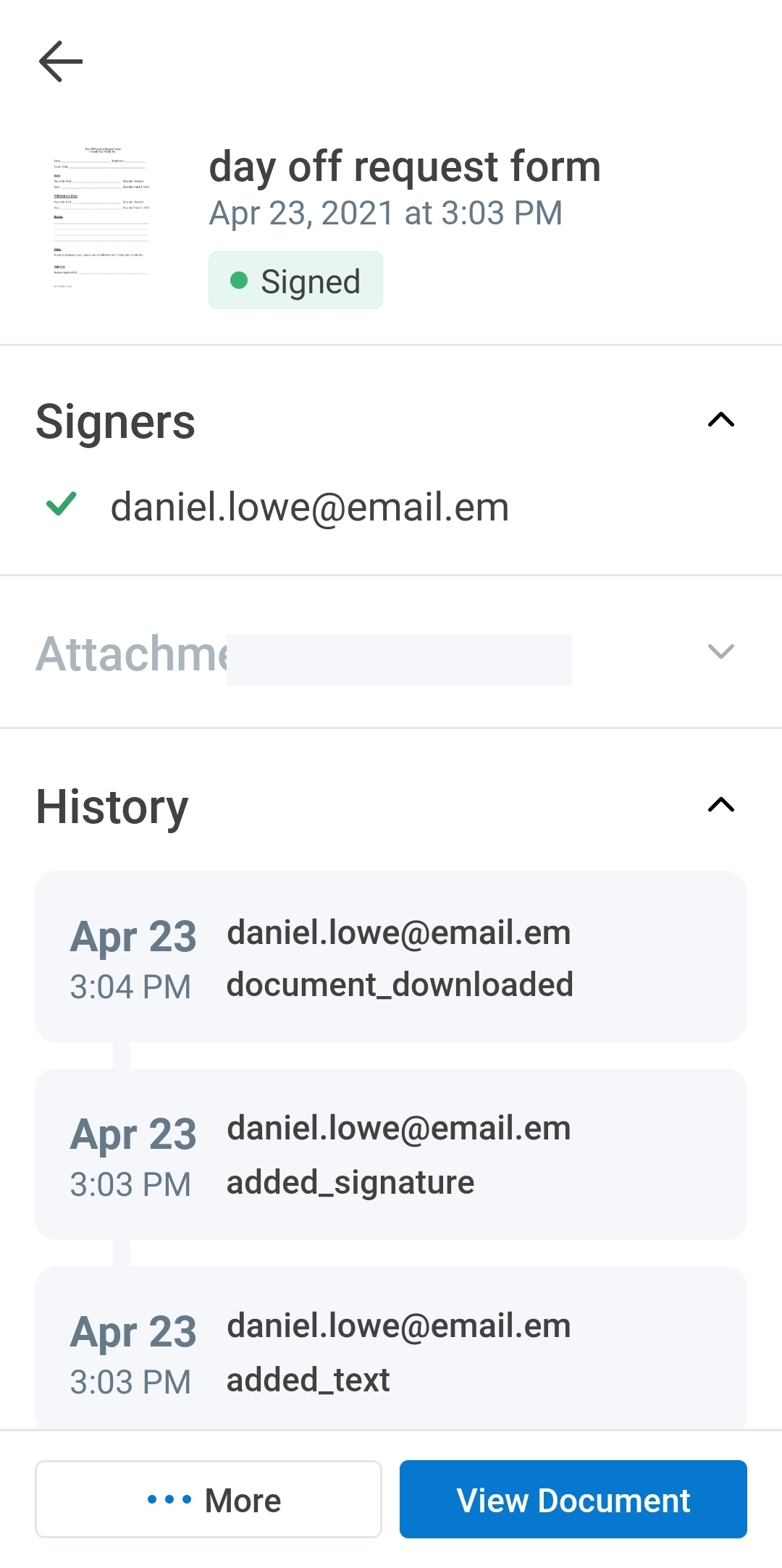 To fill out and sign a document, tap it and select Sign Document. Tap on fillable fields to activate them and add your information or eSignature.