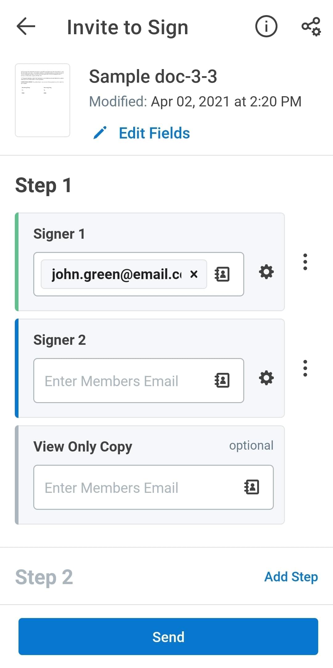 Send a document for signing by tapping on it and selecting Invite to Sign. Enter the email addresses of your recipients, assign signing roles, set a signing order, and configure signer notifications. When finished, hit the Send button.