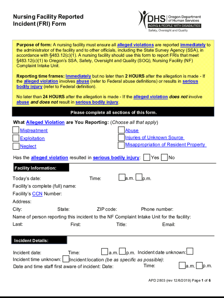 Understanding the Oregon Nursing Facility Reported Incident FRI Form