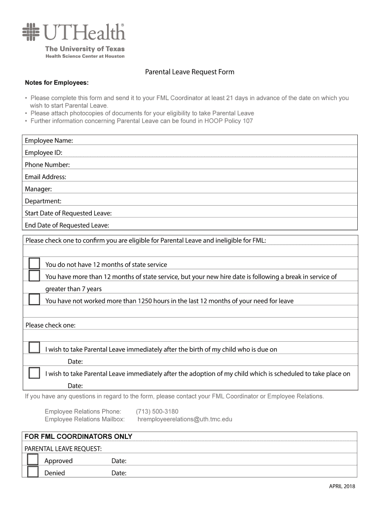 Understanding how to effectively use the parental leave request form can be illustrated through various scenarios. For instance, an employee expecting a child may fill out the form to request twelve weeks of unpaid leave under the FMLA. Another example could involve an employee adopting a child, who would also use the form to request similar leave. These examples highlight the versatility of the parental leave form in accommodating different family situations and ensuring that employees can take the necessary time off to care for their new family members.