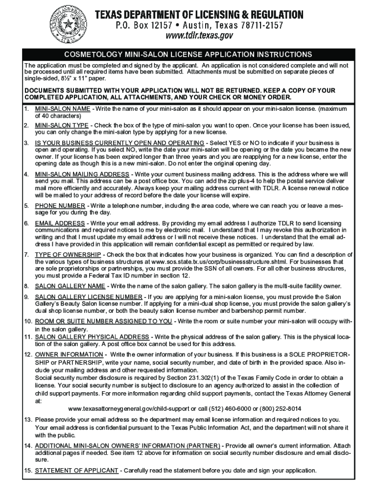 Tdlr Mini Salon License in Texas 2017-2026 Form