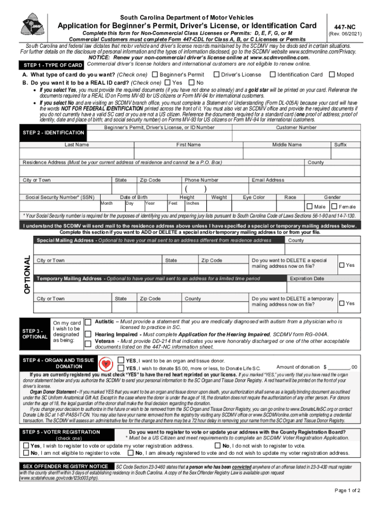 The 447 NC form is primarily used for applying for a beginner's permit or driver's license in South Carolina. This form is essential for individuals who are looking to obtain their first driver's license or permit. It includes various sections that require personal information, proof of identity, and other relevant details necessary for the application process.