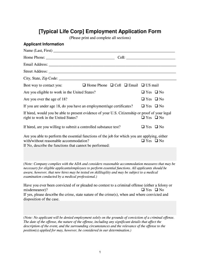 Employment Application Form Typical Life Corporation