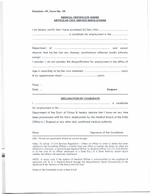 Using the Schedule I Form No 39 A involves several steps to ensure proper completion and submission. First, individuals must acquire the form from the appropriate government agency or online resource. After obtaining the form, applicants should fill it out accurately, providing all required personal and medical information. Once completed, the form must be signed by a qualified medical professional to validate the information provided.