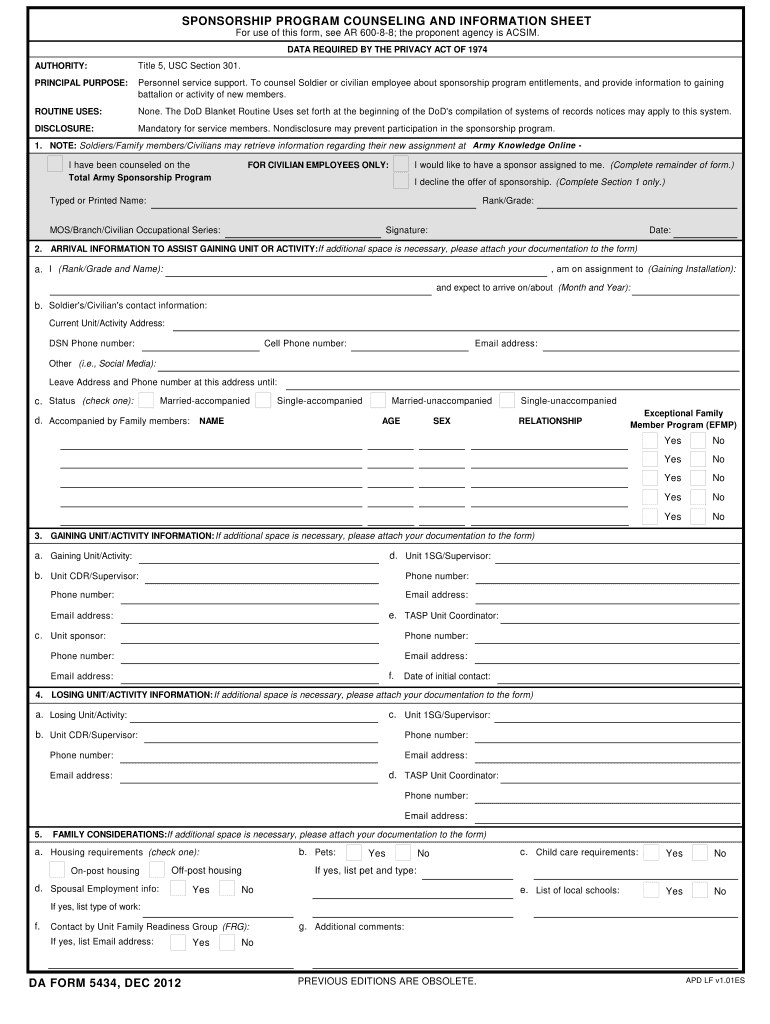 The DA Form 5434, commonly referred to as the 5434 army form, is a crucial document used within the United States military. This form serves as a means of sponsorship for soldiers, allowing them to request support for various programs and initiatives. The DA 5434 is essential for ensuring that soldiers receive the necessary assistance and resources during their service. Understanding the purpose and function of this form is vital for both service members and their sponsors.