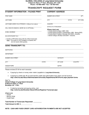 To obtain the LIU transcript request, individuals must follow a series of steps. First, they should visit the Long Island University website to access the registrar's section. Here, users can find the transcript request form, which may be available in both digital and printable formats. After completing the form with the necessary personal and academic information, applicants must submit it according to the specified submission methods, which may include online submission, mailing, or in-person delivery to the registrar’s office.