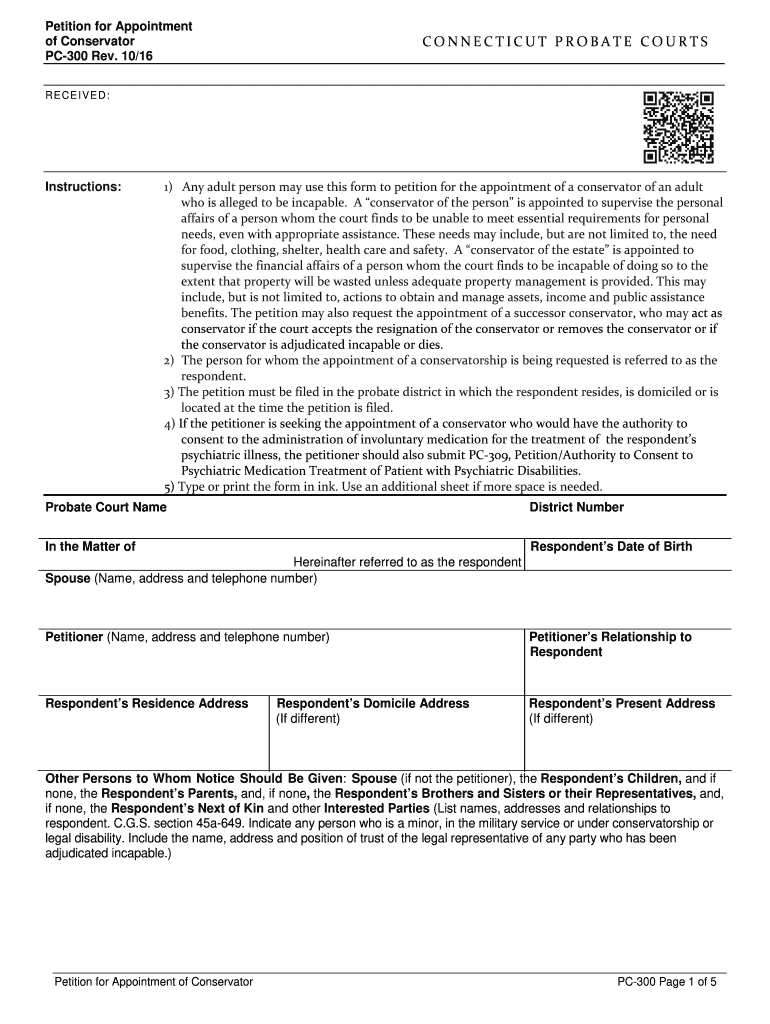 The Ct conservatorship forms are legal documents used in Connecticut to establish a conservatorship. A conservatorship is a legal arrangement where a person, known as the conservator, is appointed to manage the financial and personal affairs of another individual who is unable to do so due to incapacity or other reasons. The primary form involved in this process is the PC-300, which serves as the petition for the appointment of a conservator. This form outlines the reasons for the conservatorship and the proposed conservator's qualifications.