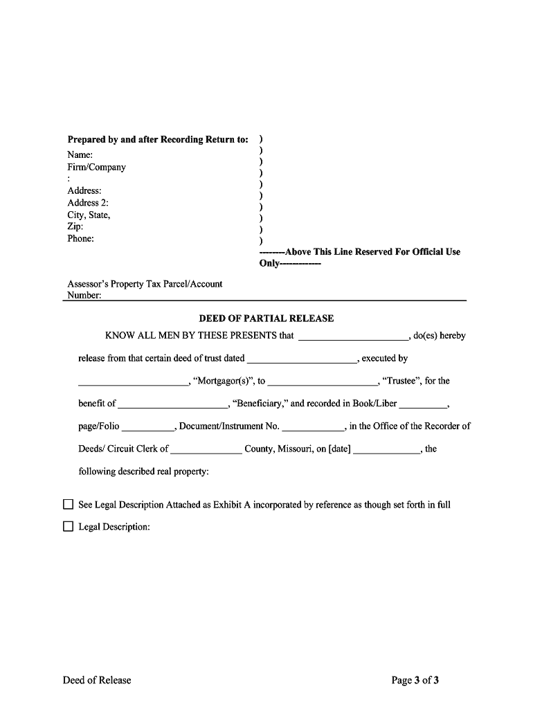 The legal use of the deed of partial release is primarily to clarify ownership interests in real property. It is often employed in real estate transactions where a portion of the property is being sold or refinanced. By executing this document, the lender relinquishes their claim on the specified section, which helps ensure that the borrower can freely transfer or manage the remaining property. Proper execution and recording of this deed are essential to uphold its legal validity and prevent future claims against the released portion.