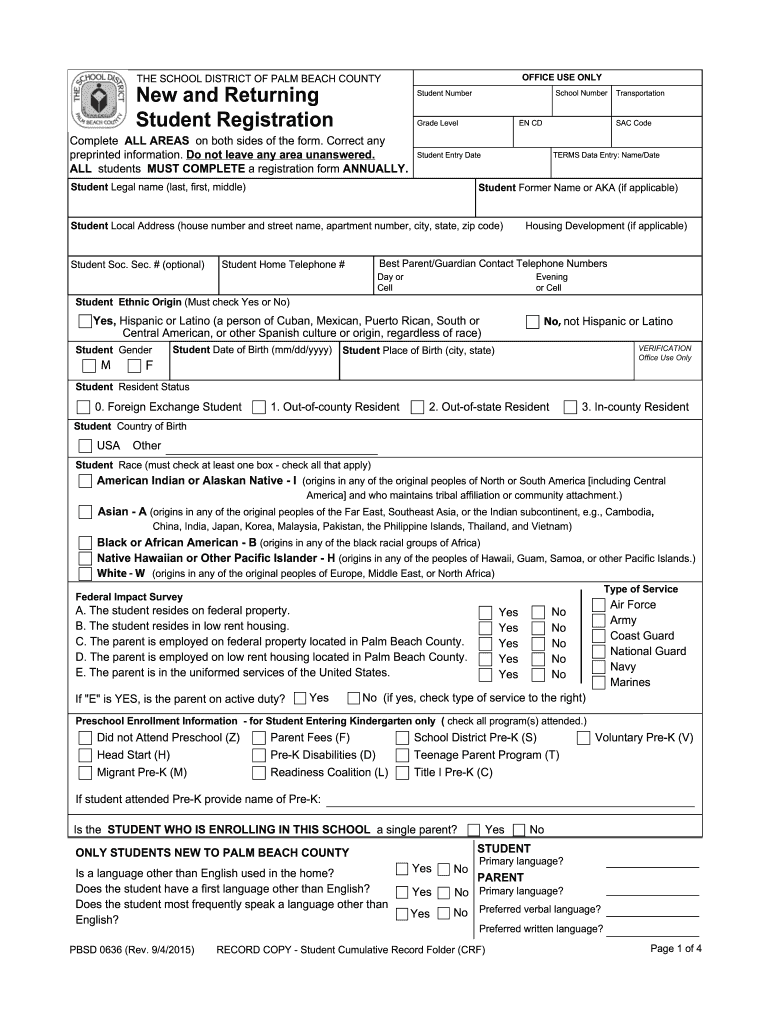 The PBSD, or Palm Beach School District form 0636, is a registration document specifically designed for new and returning students within the Palm Beach County educational system. This form collects essential information to ensure that students are properly registered for the upcoming school year. It serves as a crucial tool for maintaining accurate student records and facilitating communication between families and the school district.