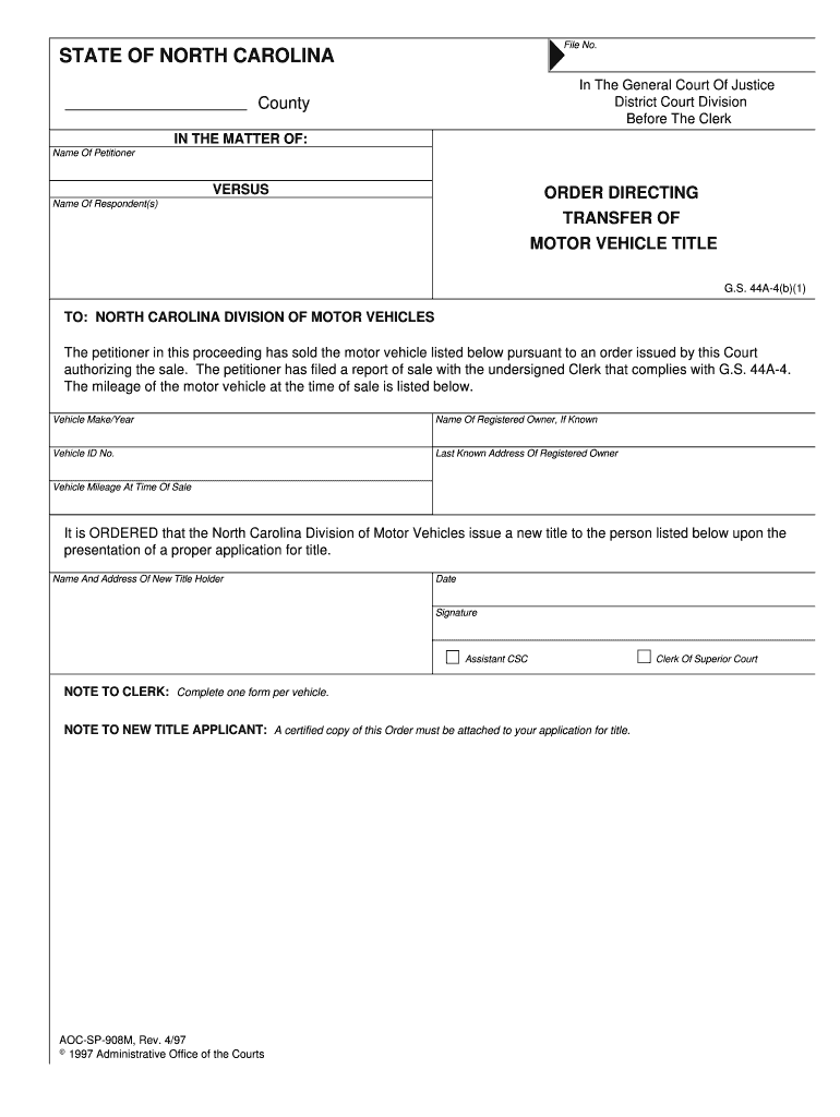 Fillable Online Order Directing Transfer of Motor Vehicle Title Form