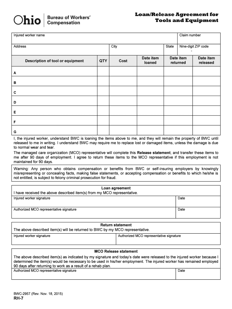 Get more for Form Bwc 2957 Form Rh 7 "LoanRelease Agreement For