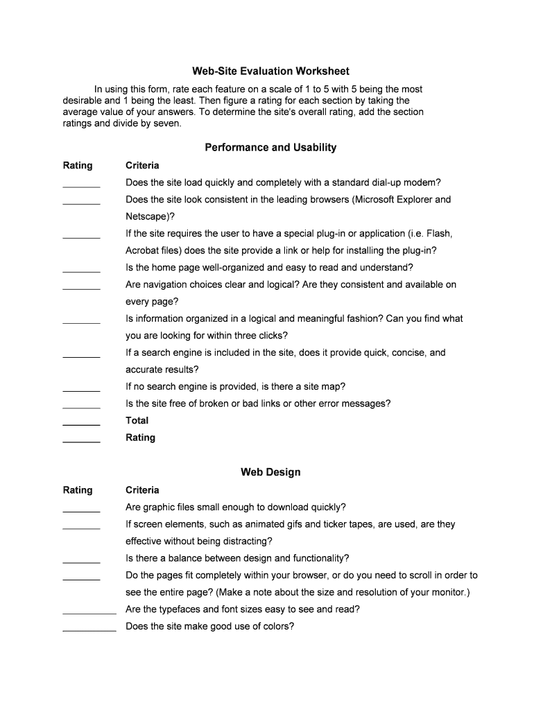 Web Site Evaluation Worksheet Form