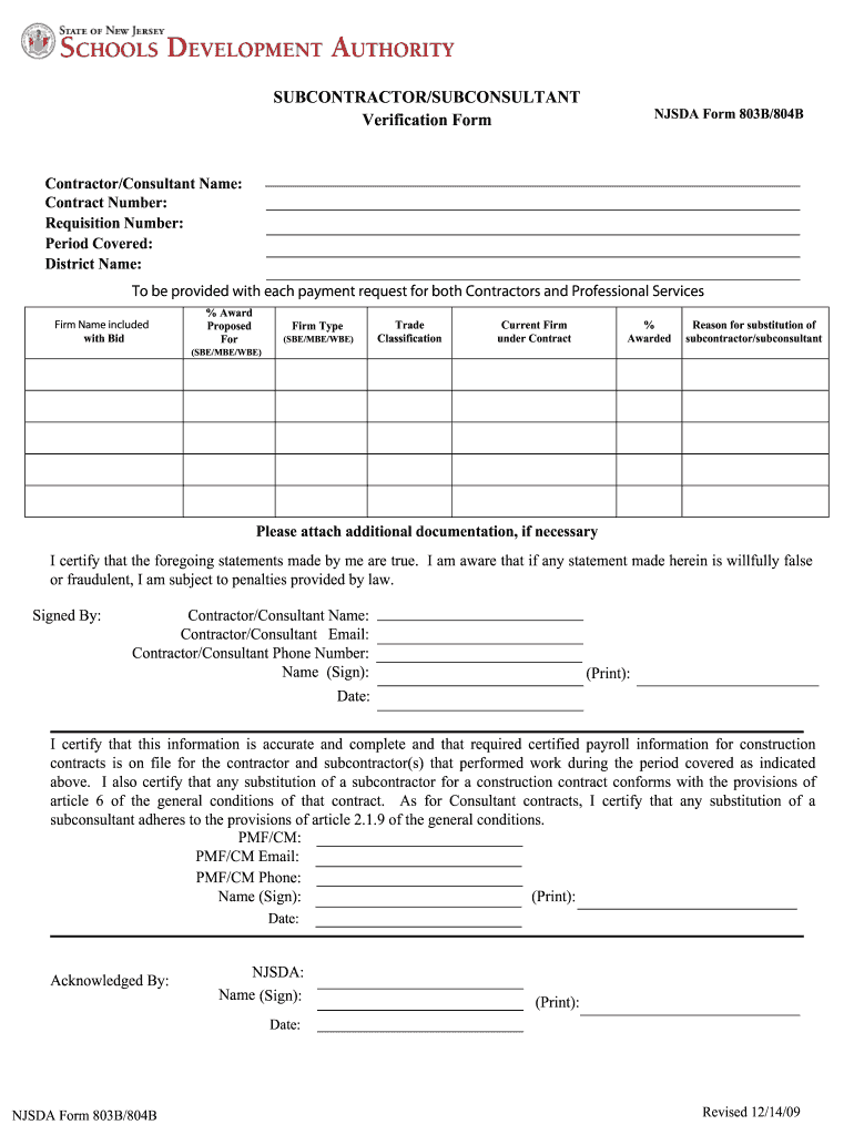 The Njsda 803b is a specific form used in New Jersey for subcontractor verification. This form is essential for businesses looking to ensure compliance with state regulations regarding subcontractor qualifications. It serves as a declaration that the subcontractor meets the necessary requirements set forth by the New Jersey Schools Development Authority (NJSDA). By completing the Njsda 803b, businesses can verify that their subcontractors possess the appropriate credentials and are eligible to work on public projects funded by state resources.
