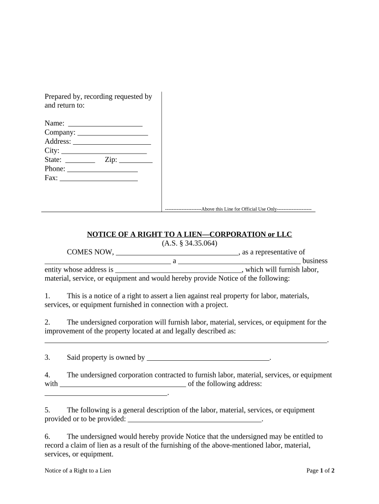 Notice of a Right to Claim Lien Corporation or LLC Alaska Form