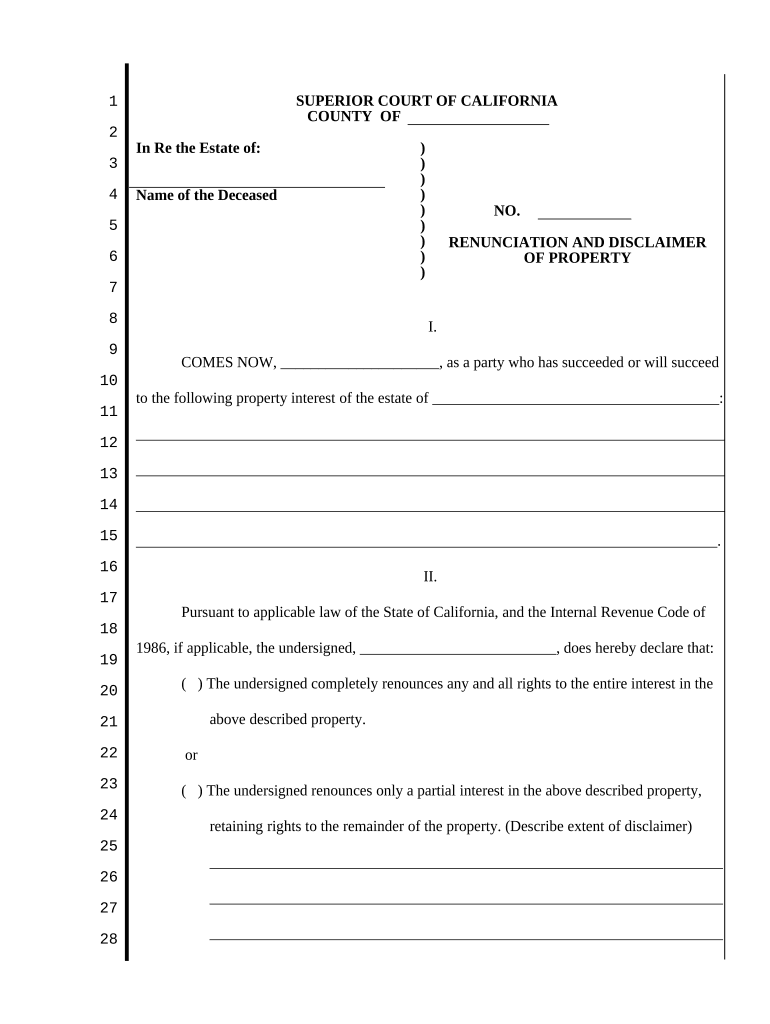 There are various scenarios in which the California Disclaimer may be utilized. For instance, if an individual inherits a property from a relative but does not wish to take ownership due to tax implications or personal reasons, they can use the disclaimer to relinquish their claim. Another example is when multiple heirs exist, and one heir decides to disclaim their share to allow the remaining heirs to inherit the property without complications. These examples illustrate the practical applications of the California Disclaimer in estate planning.