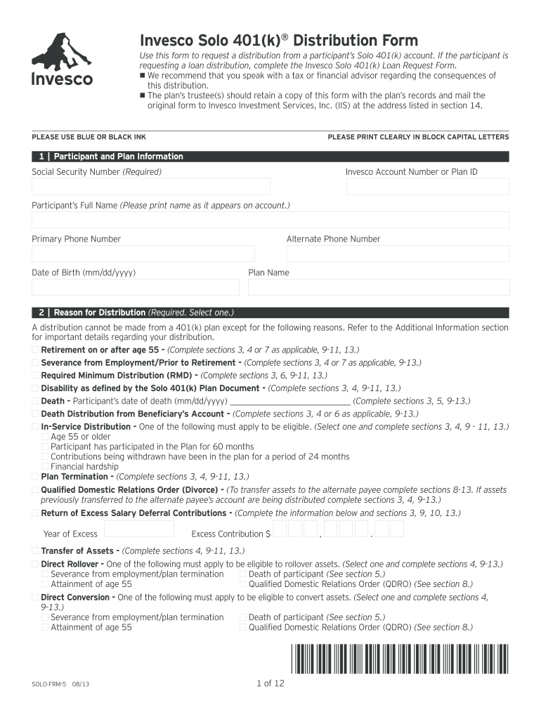 Find and fill out the correct invesco solo 401k distribution form pdf