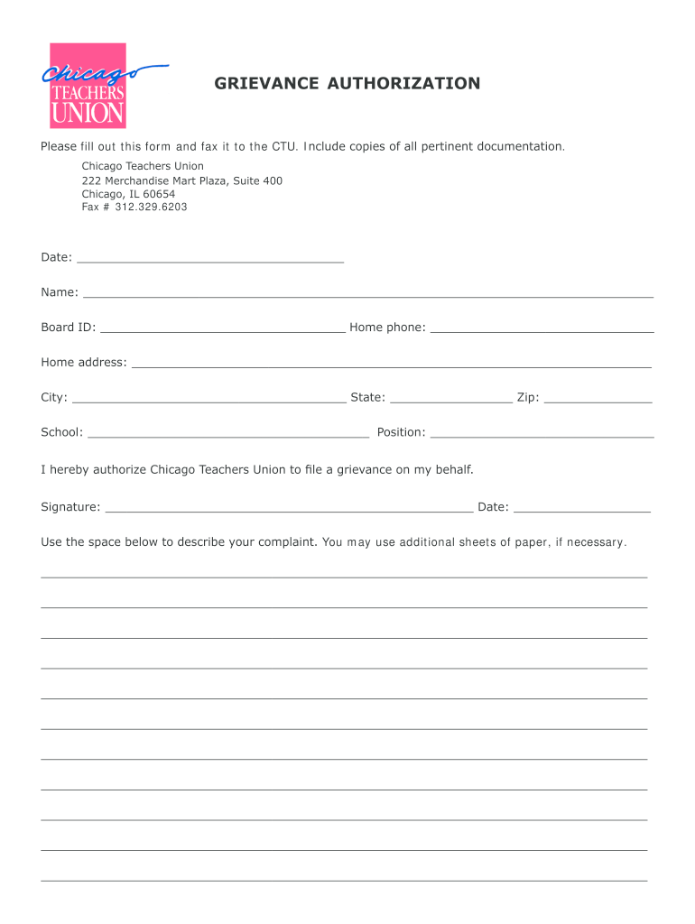The Chicago Teachers Union (CTU) grievance form is a formal document used by members to address issues or disputes within their employment context. This form serves as a mechanism for teachers to voice concerns regarding workplace conditions, contractual violations, or any other grievances that may arise. It is essential for ensuring that members' rights are protected and that their concerns are heard by the appropriate authorities.