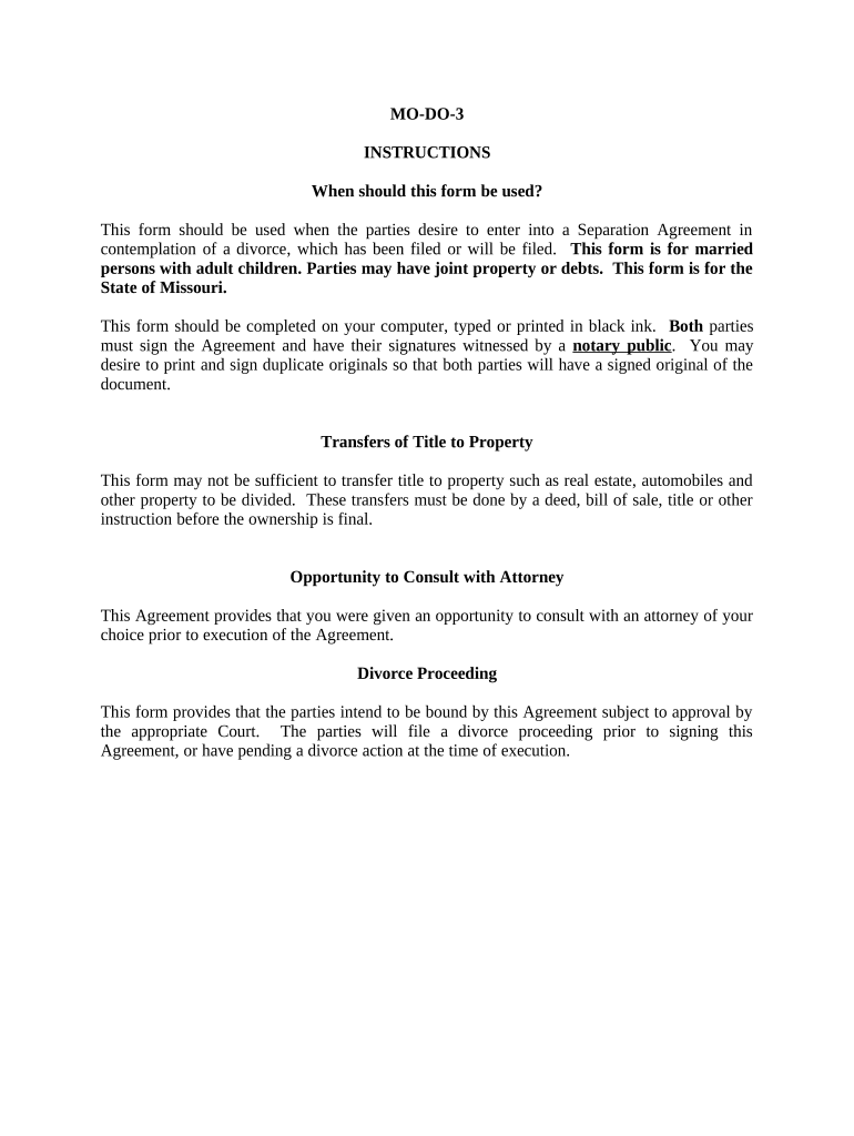 Marital Domestic Separation and Property Settlement Agreement Adult Children Parties May Have Joint Property or Debts Where Divo Form