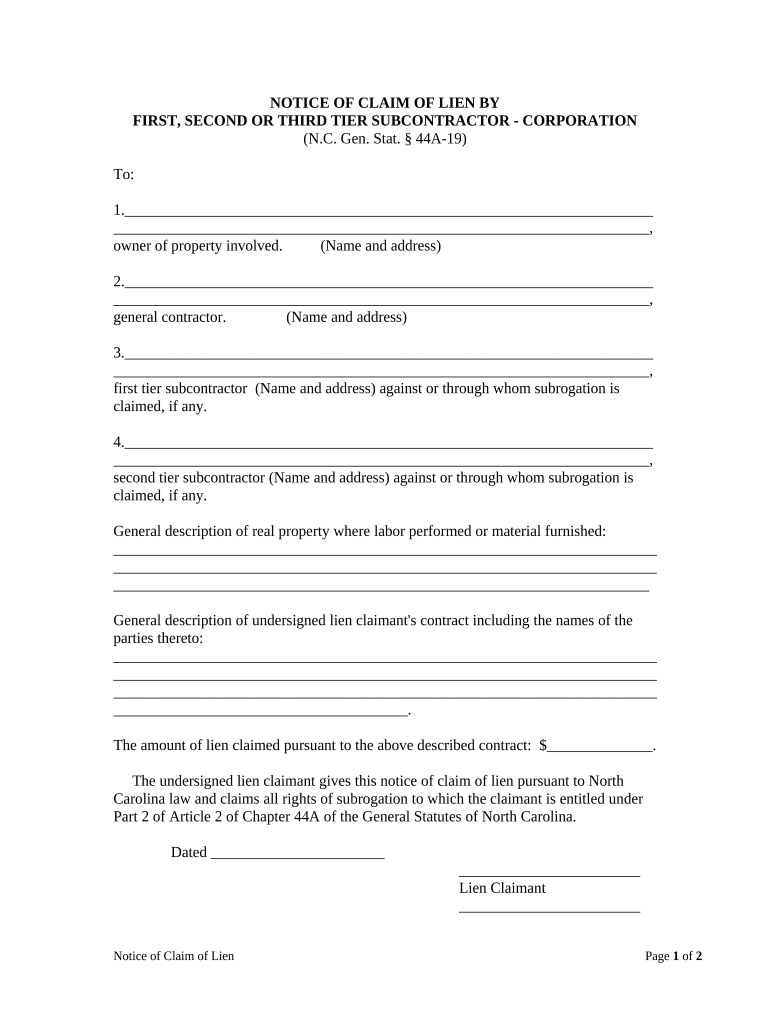What is a Notice Of Claim Subcontractor 1,2,or 3rd Tier Corporation Or LLC North Carolina?
