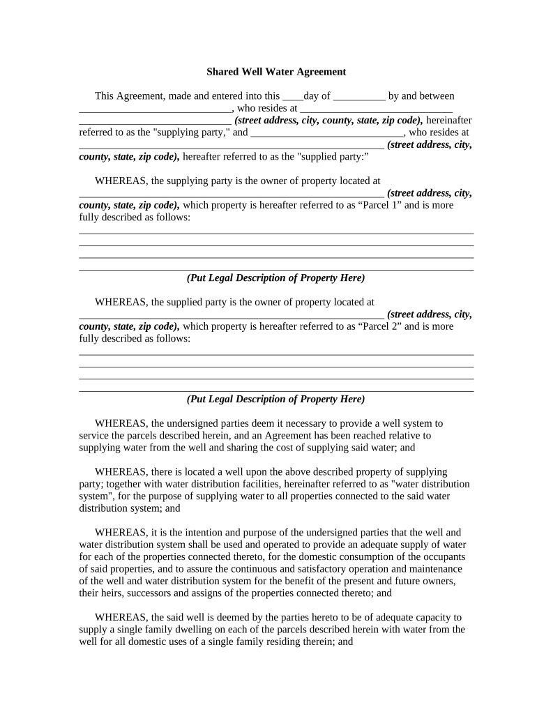 A shared well agreement is a legal document that outlines the terms and conditions under which multiple parties can access and use a single well. This agreement is crucial for establishing the rights and responsibilities of each party involved, ensuring that water usage is equitable and sustainable. It typically includes details such as the allocation of water, maintenance responsibilities, and procedures for resolving disputes. By formalizing these aspects, a shared well agreement helps prevent conflicts and promotes cooperation among users.