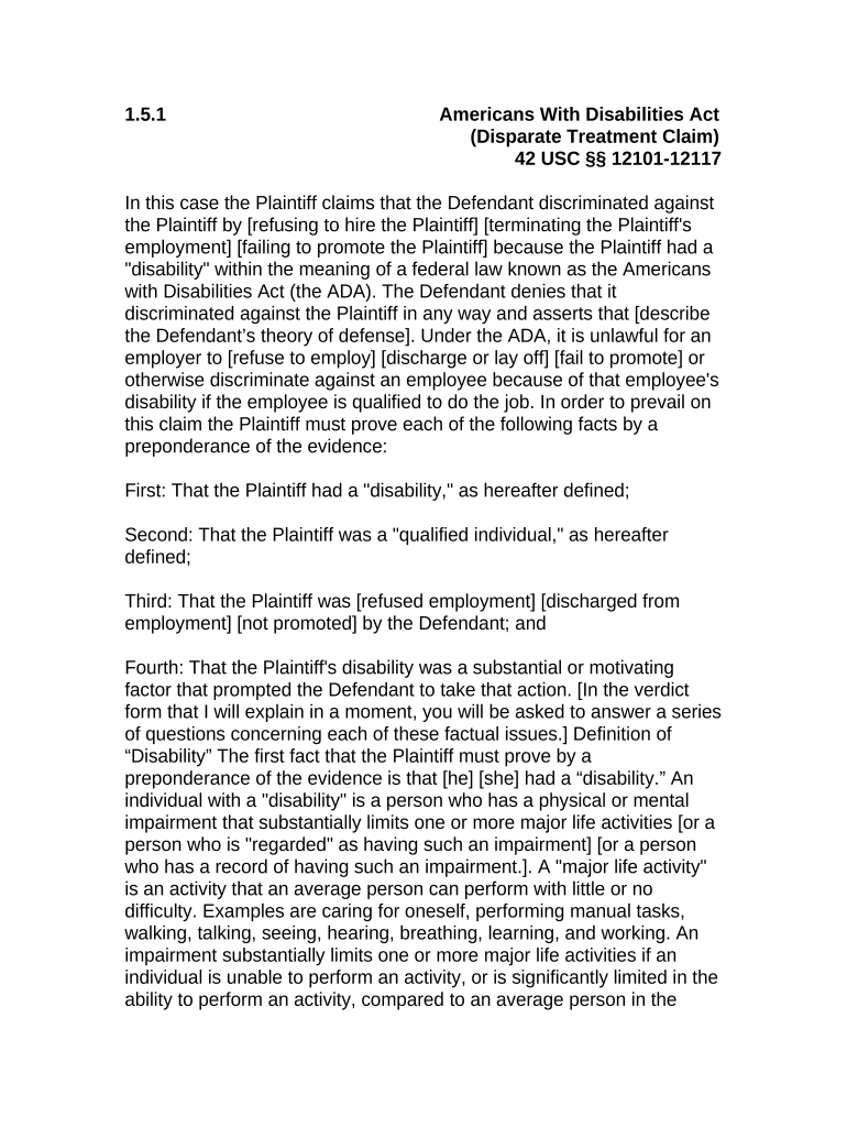 Jury Instruction 1 5 1 Americans with Disabilities Act 42 USC Sect 12101 12117 Disparate Treatment Claim Form
