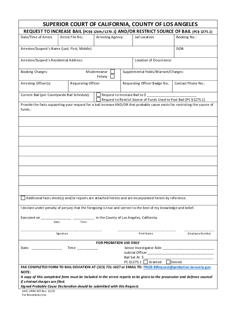 The increase bail form is a legal document used to request a modification of bail conditions, specifically to raise the amount of bail set by the court. This form is essential in situations where the initial bail amount may be deemed insufficient to ensure the defendant's appearance in court or to address public safety concerns. Understanding the legal implications and requirements of this form is crucial for both defendants and their legal representatives.