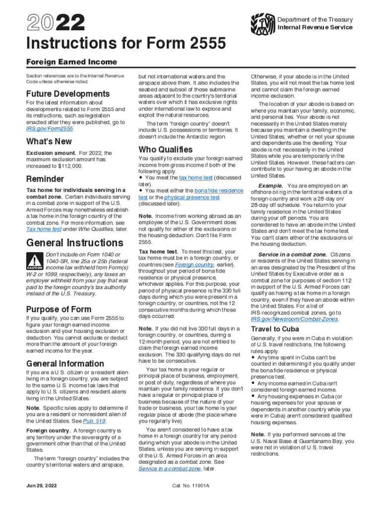 The IRS Instructions 2555 provide essential guidance for U.S. citizens and resident aliens who earn income abroad. This form is crucial for reporting foreign earned income and claiming the foreign earned income exclusion. To qualify, individuals must meet specific eligibility criteria, including passing the bona fide residence test or the physical presence test. Understanding these instructions is vital for ensuring compliance with U.S. tax laws while maximizing potential tax benefits related to foreign income.