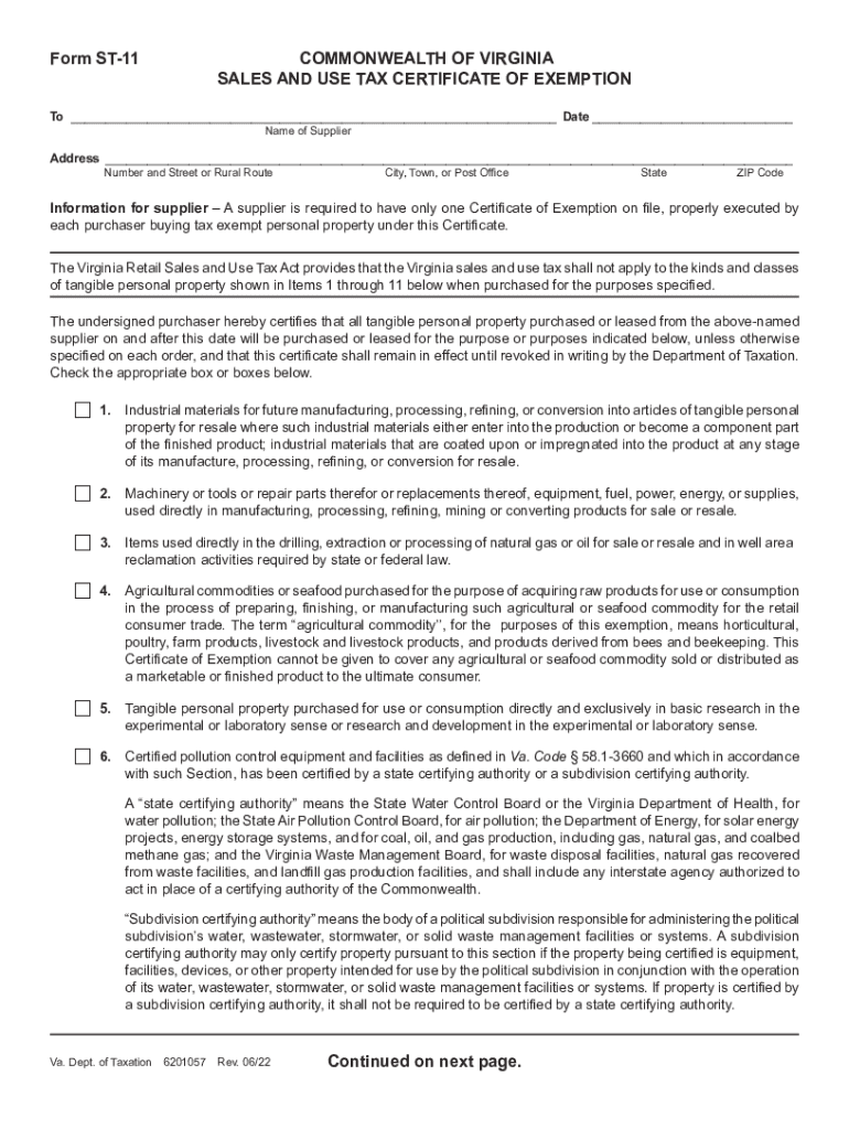 The legal use of the Virginia Form ST-11 is governed by state tax laws. The form must be used only for qualifying purchases that fall under the exemption categories specified by the Virginia Department of Taxation. Misuse of the form can lead to penalties, including back taxes owed and potential fines. It is crucial for entities to understand their eligibility and ensure that they are using the form in compliance with all applicable regulations.