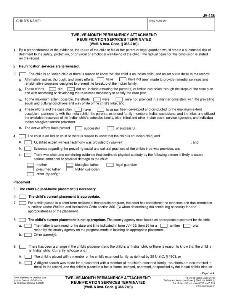 The Form JV 438, also known as the Twelve Month Permanency Attachment, is a crucial document used in the context of California's child welfare system. This form is designed to provide a comprehensive overview of a child's permanency plan after twelve months of placement in out-of-home care. It serves as a tool for social workers, courts, and other stakeholders to assess the progress and ongoing needs of the child, ensuring that their best interests are prioritized.