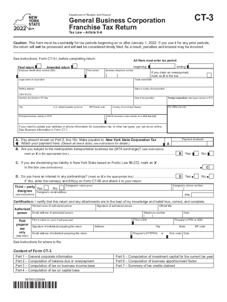 Form CT-3 is the New York State tax form used by general business corporations to report their franchise tax. This form is essential for corporations operating in New York, as it provides the necessary information regarding income, deductions, and credits. The completion of Form CT-3 is required to determine the corporation's tax liability based on its business activities within the state.