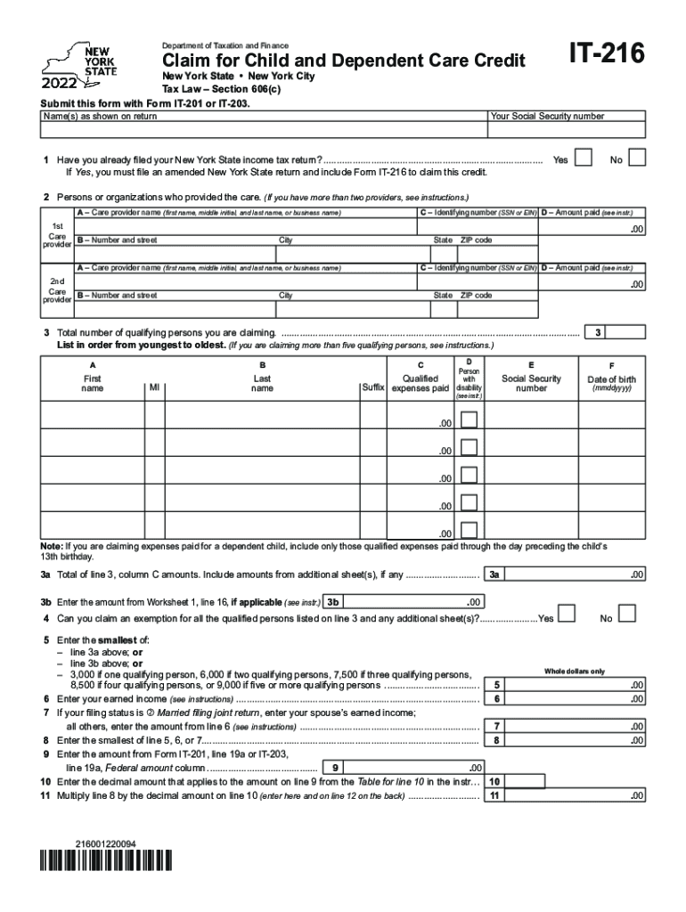 How to use the Form IT 216 Claim For Child And Dependent Care Credit