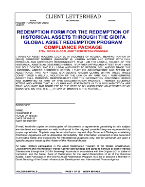 The legal use of the Global Asset Redemption Program is governed by various statutes and regulations that ensure its integrity and legitimacy. Compliance with these laws is essential for participants to avoid penalties and ensure their claims are processed smoothly. This includes adhering to guidelines set forth by the IRS and other regulatory bodies, which outline the proper procedures for asset redemption.