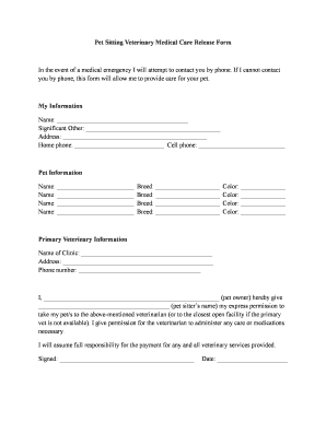 A pet sitting medical care release form is a legal document that gives pet sitters permission to seek veterinary care for your pet in case of an emergency. This form ensures that your pet receives the necessary medical attention while you're away, providing peace of mind for pet owners. It can be easily customized for your specific needs using airSlate SignNow.