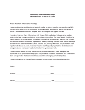 Using the Arestin consent form involves several steps to ensure that it is completed accurately and effectively. First, the dental professional should provide a clear explanation of the scaling and root planing procedure, including how Arestin will be used as part of the treatment. Next, the patient should be given ample time to read the consent form thoroughly. It is essential for the patient to ask questions about any aspects they do not understand. Once the patient feels informed, they can sign the form, indicating their consent to the procedure. This process not only fosters trust but also ensures compliance with legal requirements.