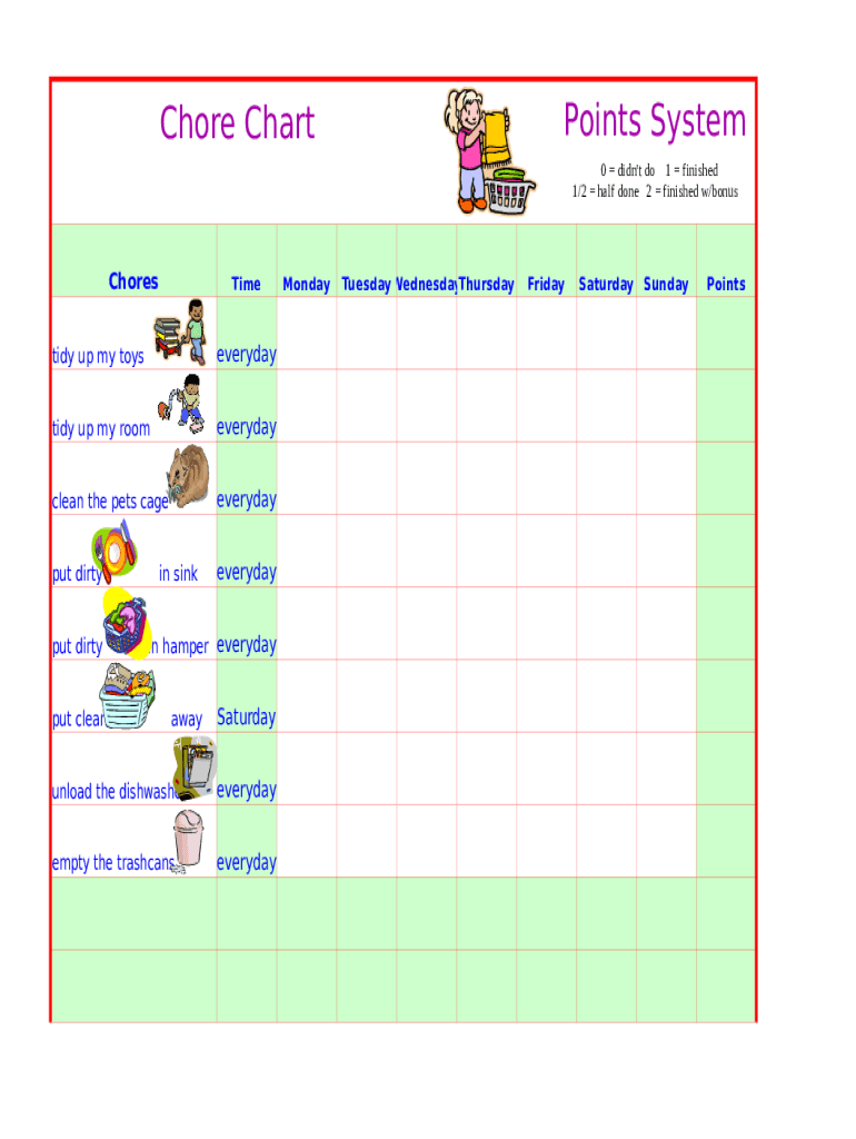 Several key elements contribute to the effectiveness of a chore chart spreadsheet. These include: