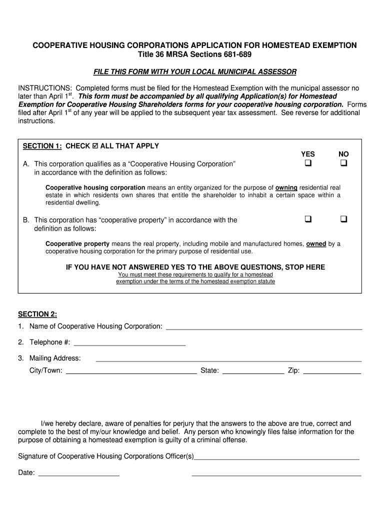 COOPERATIVE HOUSING CORPORATIONS APPLICATION for HOMESTEAD EXEMPTION Title 36 MRSA Sections 681 689 Maine Form