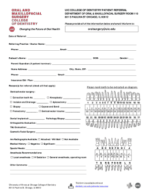 The UIC referral is a formal document used primarily within the UIC College of Dentistry to facilitate patient referrals. This form allows dental professionals to refer patients to specialists within the university system, ensuring that patients receive the appropriate care tailored to their specific needs. The UIC referral encompasses various specialties, including endodontics, oral surgery, and prosthodontics, making it a versatile tool for dental practitioners.