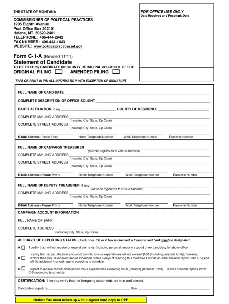 The legal use of the Montana Form C 1 A is governed by state regulations. To be considered legally binding, the form must be completed accurately and submitted in accordance with the specified guidelines. It is crucial to ensure compliance with all relevant laws to avoid potential penalties or legal issues. Understanding the legal implications of the information provided on the form is essential for both individuals and businesses.