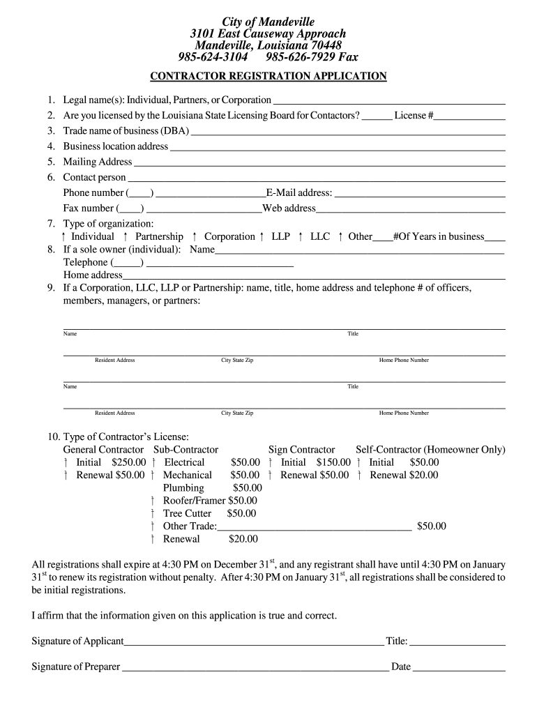 Contractor Registration the City of Mandeville Form