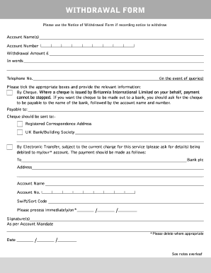 Using the Britannia Withdrawal Form involves several straightforward steps. First, you need to obtain the form, which can usually be found on the bank's website or at a local branch. Once you have the form, fill it out carefully, providing accurate information about your account and the withdrawal amount. After completing the form, you may submit it online, by mail, or in person at your local branch, depending on the bank's guidelines. Ensuring that all details are correct will help avoid any delays in processing your request.