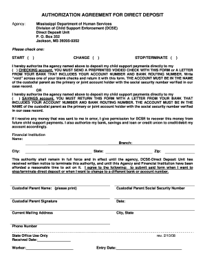 Quick guide on how to complete authorization agreement for direct deposit mississippi department mdhs state ms