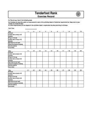 Using the tenderfoot fitness log involves several straightforward steps. First, individuals should familiarize themselves with the requirements outlined in the tenderfoot fitness requirements worksheet. Next, they can begin logging their physical activities, including exercises such as running, swimming, or team sports. Each entry should include the date, type of exercise, duration, and any additional notes on performance. Regular updates to the log will help track progress and identify areas for improvement.
