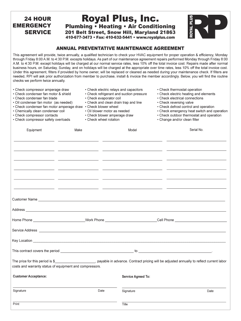 HVAC Service Agreement Royal Plus Home & Commercial Form