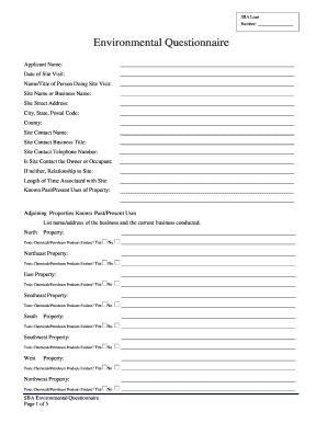 The SBA Environmental Questionnaire is a critical document used in the loan application process for Small Business Administration (SBA) loans. It assesses the environmental risks associated with a property or business that is seeking funding. This questionnaire helps lenders determine whether the property meets environmental standards and complies with federal regulations. By identifying potential environmental issues, such as contamination or hazardous waste, the questionnaire ensures that both the lender and borrower are aware of any liabilities that may arise from environmental concerns.